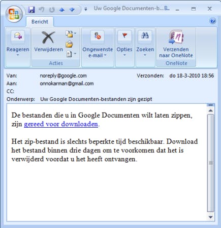 Zodra alle bestanden gezipt zijn, dan stuurt Google u een e-mail met een directe link naar het gezipte exportbestand. Voor de veiligheid is deze link maar beperkte tijd beschikbaar. Na drie dagen zal de link komen te vervallen.