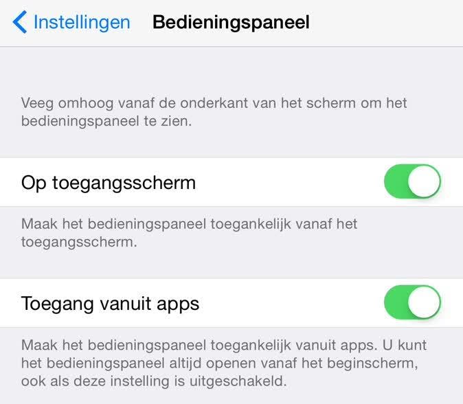 In dit menu kun je ook de toegang tot het bedieningspaneel uitschakelen vanuit apps. Als je veel actiegames speelt, kan dit van pas komen.