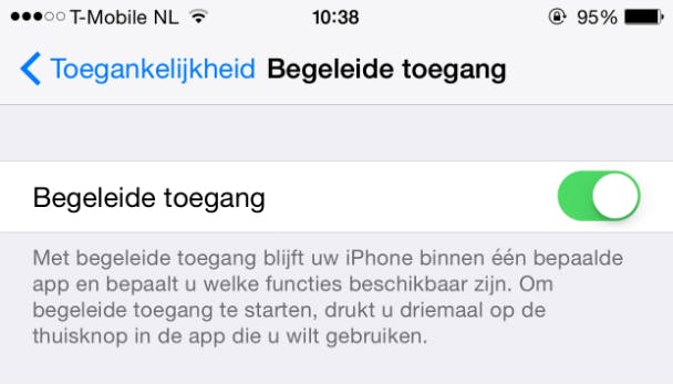 De app kan nu alleen verlaten worden door drie keer op de thuisknop te drukken en de viercijferige code in te voeren. Ook Touch ID kan worden ingesteld zodat de code niet hoeft te worden gebruikt.