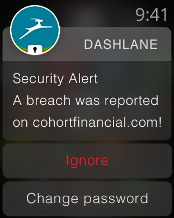 Dashlane geeft waarschuwingen op je Apple Watch weer waarop je kunt reageren.