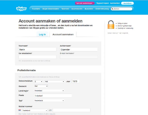 Om Skype te gebruiken, dient u eerst een gratis account aan te maken. Surf naar Skype en klik op de knop Inschrijven. U komt op de registratiepagina terecht, waarop u een aantal persoonlijke gegevens moet opgeven. Let goed op welke informatie verplicht is en welke niet. Er wordt bijvoorbeeld gevraagd om uw mobiele nummer, maar u bent niet verplicht dit veld in te vullen. Tot slot dient u nog een anti-spamcode in te voeren zodat Skype weet dat u geen spamrobot bent. Klik op Ik ga akkoord - Doorgaan.