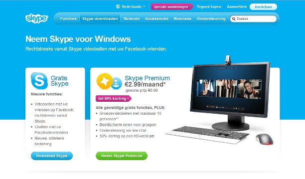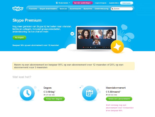 Een Skype-account is gratis, tenzij u belt naar vaste of mobiele nummers, of een Premium-account neemt. Hiermee kunt u videobellen met meerdere mensen tegelijk (maximaal 9). De kosten hiervan zijn 6 euro als u per maand betaalt, 20,50 euro als u per drie maanden betaalt en 82,50 euro wanneer u per 12 maanden betaalt. Naast videobellen met groepen krijgt u als Premium-gebruiker ook geen advertenties van derden te zien, en kunt u het beeldscherm delen met groepen.