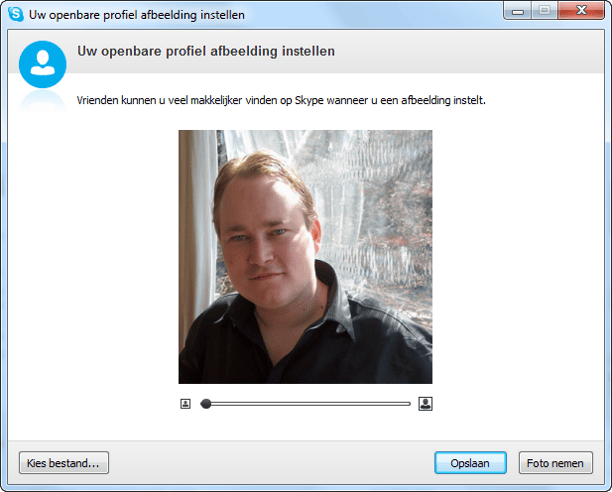Na installatie kunt u direct inloggen met uw gebruikersnaam en wachtwoord. Onderin het inlogvenster kunt u aangeven of Skype automatisch moet starten als Windows start en of u dan ook aangemeld wilt worden. Voer uw inloggegevens (uit stap 1) in en klik op Aanmelden. Zodra u bent ingelogd verschijnt er een welkomstvenster en hebt u de mogelijkheid een afbeelding in te stellen. Hebt u een webcam, dan wordt deze automatisch ingeschakeld en klikt u op Foto nemen om een foto te nemen. Anders klikt u op Kies bestand om een afbeelding te selecteren.