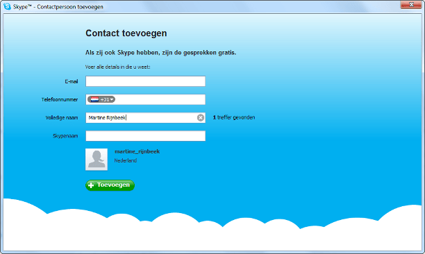 U hebt nu een account, maar nog geen contactpersonen. U kunt op twee manieren contactpersonen toevoegen. Via het welkomstvenster ziet u de optie Vind vrienden op Skype. Klikt u hierop, dan kunt u contactpersonen importeren vanuit Facebook, Hotmail, Gmail en vele andere netwerken. U hebt dan direct een flinke lijst met andere Skype-gebruikers. Wilt u een individuele gebruiker toevoegen, klik dan in het linkerdeelvenster op Contact toevoegen om contactpersonen te zoeken aan de hand van hun naam, accountnaam, e-mailadres of telefoonnummer.