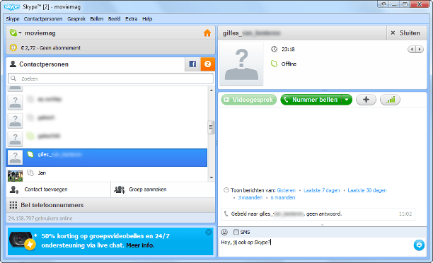 Bellen is nu heel eenvoudig. In het overzicht met contactpersonen ziet u verschillende pictogrammen. Belangrijk om te weten is dat het groene pictogram van een telefoon staat voor een vaste of mobiele lijn. Wilt u hiernaar bellen dan moet u betalen, zie stap 9. Het bellen naar een ander Skype-account is gratis, en wordt aangeduid met een groen pictogram zonder telefoon. Klik op een contactpersoon om een gedetailleerde weergave te zien. Vervolgens kunt u klikken op Videogesprek om een gesprek met video te beginnen of Bellen om een 'gewoon' gesprek te beginnen.