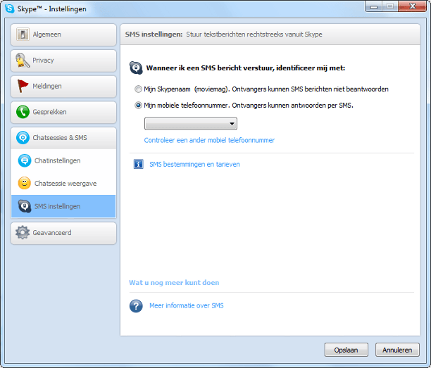 Wanneer u een sms stuurt via Skype, ziet de ontvanger uw accountnaam als afzender. Niet handig, want die persoon kan dan niet reageren. Gelukkig kunt u ook uw eigen mobiele nummer laten weergeven. In het berichtenvenster ziet u Aan: en Van: waarbij achter de laatste uw accountnaam staat. Klik hierop en selecteer Mijn mobiele telefoonnummer. Geef uw nummer op en klik op Versturen. Voer vervolgens een code in die u per sms krijgt. Klik op Bevestigen en voortaan wordt uw nummer weergegeven bij het sms'en.