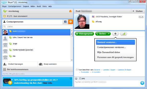 Skype is niet direct bedoeld als uitgebreid chatprogramma, maar het heeft wel wat meer dan enkel basale chatmogelijkheden. U kunt namelijk ook heel eenvoudig bestanden sturen naar uw Skype-contactpersonen. Het laat zich raden dat dit alleen mogelijk is wanneer het om een Skype-account gaat, en dus niet om vaste of mobiele telefoonnummers. Open wederom de detailweergave van een contactpersoon en klik op het plusteken naast Bellen. U ziet vervolgens de optie Bestand versturen. Klik hierop om een bestand van de harde schijf te selecteren, dat u vervolgens verzendt.