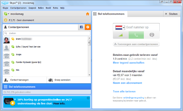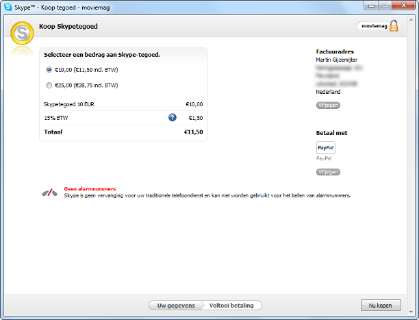 U kunt geen telefoonnummers bellen zonder Skype-tegoed. Dit tegoed kunt u eenvoudig aanvragen door in het venster Bel telefoonnummers te klikken op Meer tegoed aanschaffen. In het venster dat verschijnt, kunt u kiezen tussen twee bedragen: 10 of 25 euro. U dient vervolgens wat factuurgegevens in te voeren (zoals een factuuradres) en een betaalmethode te selecteren. Gelukkig zijn er legio betaalmogelijkheden, zoals overschrijving, creditcard, PayPal en iDeal. Het tegoed wordt direct bijgeschreven, behalve bij een handmatige overschrijving.