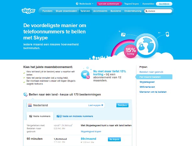 Wanneer u merkt dat u regelmatig nieuw Skype-tegoed moet kopen, is het wellicht verstandiger om een abonnement te nemen. Gek genoeg gaat dit niet via het programma, maar via de website van Skype. Surf naar Skype en klik op Tarieven / Per maand betalen. Op de pagina die verschijnt, kunt u verschillende abonnementen selecteren. Typ bijvoorbeeld Nederland in het zoekveld om abonnementen te vinden voor bellen in Nederland (en te zien hoeveel u bespaart). Zo zijn er ook pakketten voor andere landen, Europa en de hele wereld.