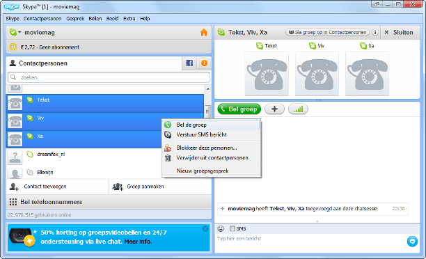 Met Skype kunt u - net als met de 'ouderwetse' telefoon - één persoon bellen, maar u kunt ook een groepsgesprek starten. De eenvoudigste manier om dit te doen is door de Ctrl-toets ingedrukt te houden en in de lijst met contactpersonen de mensen te selecteren die u wilt bellen. Klik met de rechtermuisknop op deze selectie en klik op Bel de groep. U begint dan automatisch een groepsgesprek (alleen audio). Wilt u vaker een gesprek starten met deze groep, dan kunt u de personen selecteren en onderin klikken op Groep aanmaken.