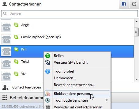 Wat als u allerlei mensen hebt toegevoegd door ze in één keer te importeren, maar niet aan iedereen wilt laten zien wanneer u online bent? Door te klikken op Skype / Online status, kunt u uw status aanpassen naar bijvoorbeeld offline. Dat geldt echter voor iedereen. Om u voor één persoon offline te tonen, kunt u deze contactpersoon (al dan niet tijdelijk) blokkeren. Klik met de rechtermuisknop op de persoon en kies Blokkeer deze persoon. Wilt u hem definitief verwijderen, dan klikt u met de rechtermuisknop en kiest u Verwijderen uit contactpersonen.