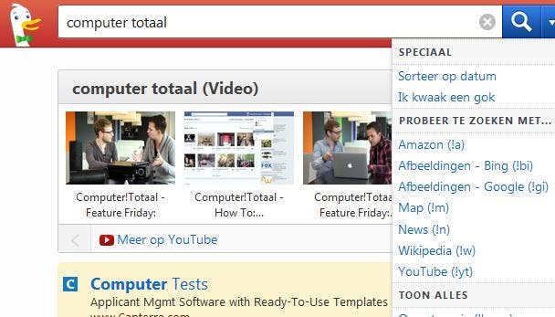 Het voordeel van DuckDuckGo is dat deze zoekmachine je vrij laat in wat jij belangrijk vindt. Add-ons worden ondersteund, maar je kunt ook bij gebrek aan goede zoekresultaten via DuckDuckGo zoeken in Bing of Google. Als je op zoek bent naar producten, dan kan het ook bij bijvoorbeeld Amazon.com. Dit doe je door naar het blauwe icoontje met neerwaartse pijltje te drukken. Deze vind je direct rechts van de zoekbalk.