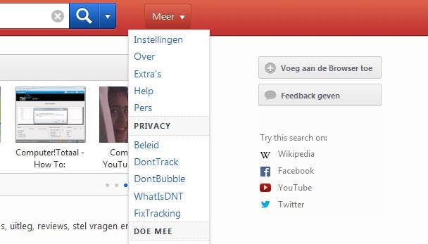 DuckDuckGo speelt in op privacy en dat zie je terug als je de add-on hebt geïnstalleerd op je webbrowser of opent via het web. Op de pagina van de zoekmachine zie je naast de zoekbalk een klein rood blokje met Meer erop staan. Als je deze aanklikt en je gaat naar Instellingen dan valt meteen op dat alle opties op default staan. De machine geeft dus geen informatie over vanaf waar je het internet bezoekt, waar je naar zoeken via welk ip-adres je er bent gekomen. Je kunt die instellingen aanpassen naar eigen wens, dit was met de Epic Privacy Browser wel anders. Je geeft zo wel deels je identiteit prijs.