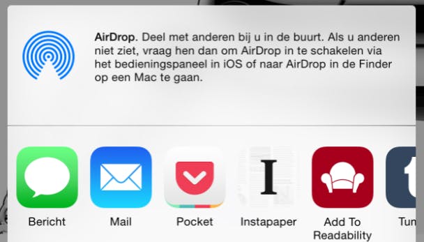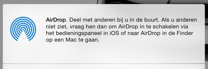 In iOS 7 kregen de iPhone en de iPad de mogelijkheid om bestanden te delen via de AirDrop-functie. De apparaten moeten zich in dezelfde ruimte bevinden met bluetooth en Wi-Fi ingeschakeld. In iOS 8 is de Airdrop-functionaliteit verbeterd. Inmiddels is het ook mogelijk om tussen een iPad of iPhone en een Mac bestanden over te zetten. Er zijn beperkingen, maar het systeem werkt simpel en snel.