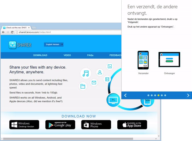 SHAREit is ontwikkeld door Lenovo om bestanden uit te wisselen tussen apparaten bij jou in de buurt. Het programma werkt ideaal in een thuissituatie met een iPad, Android-smartphone en Windows-computer. Ook kun je eenvoudig bestanden uitwisselen met kennissen die bij je op bezoek zijn. Je kunt bestanden tussen mobiele apparatuur onderling uitwisselen of met je computer.