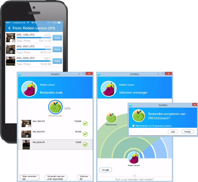 Technische kennis is niet nodig. Alleen een overijverig beveiligingsprogramma op je computer kan roet in het eten gooien door de boel te blokkeren. Mocht dit gebeuren, dan sta je SHAREit toe om verbinding te maken met je netwerk. De software is nodig op alle apparaten waartussen je bestanden wilt versturen. Je vindt het programma voor mobiele platforms (iOS, Android en Windows Phone) in de app store van je toestel of via deze website.