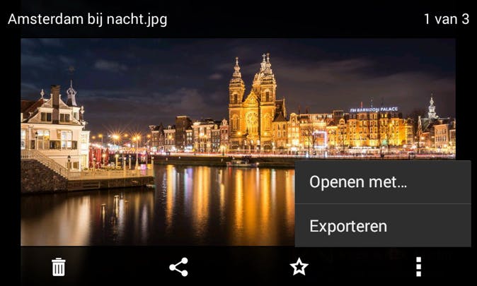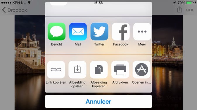 Op een iPhone of iPad tik je op het delen-pictogram (vierkantje met omhoog wijzende pijl erin). Hier zie je al direct een rijtje algemene apps zoals Bericht, Mail en Twitter om het bestand te versturen of te delen met anderen. Bij een foto of een filmpje zie je ietsje lager in het grijs een optie om het beeldmateriaal op te slaan in de filmrol. Ook vind je hier de optie Openen in, waarmee je het bestand rechtstreeks doorstuurt naar een app die speciaal voor dit bestandstype is bedoeld. Wat je hier te zien krijgt, hangt (net als op Android) af van welke apps jij geïnstalleerd hebt. Bestanden overzetten naar je pc werkt op dezelfde manier. Je slaat ze via de app of website op in je online-opslagruimte en pakt ze vervolgens op je pc of Mac weer op.