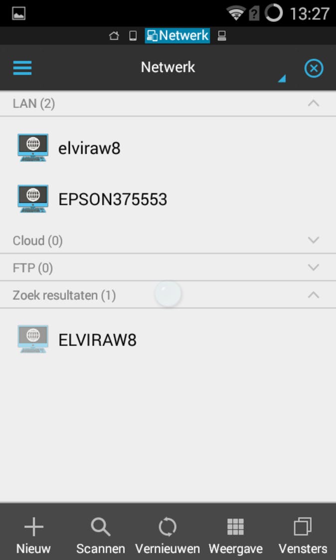 Verbinding maken kan ook via tabblad Lokaties door via het plusteken handmatig een netwerkapparaat in te voeren. In ES File Explorer tik je linksboven op de drie liggende streepjes. Kies Netwerk in het gelijknamige onderdeel. Tik op Scannen om het netwerk af te zoeken of gebruik het plusteken om handmatig een opslagapparaat in te voeren.