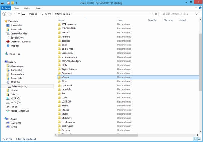 Bestanden overzetten hoeft natuurlijk niet altijd via een online-opslagdienst of het thuisnetwerk te gebeuren. Uitwisselen tussen een computer en je smartphone of tablet kan ook rechtstreeks door gewoon een usb-kabel te gebruiken. Lekker makkelijk én veel sneller snel. Vooral met een Android-apparaat werkt dit zeer goed, je krijgt dan namelijk in Windows Verkenner netjes een extra schijf te zien. Zodoende kun je op je gemak door de mappen op je telefoon of tablet bladeren en bestanden heen en weer kopiëren of verplaatsen, gewoon zoals je dat van je pc gewend bent.