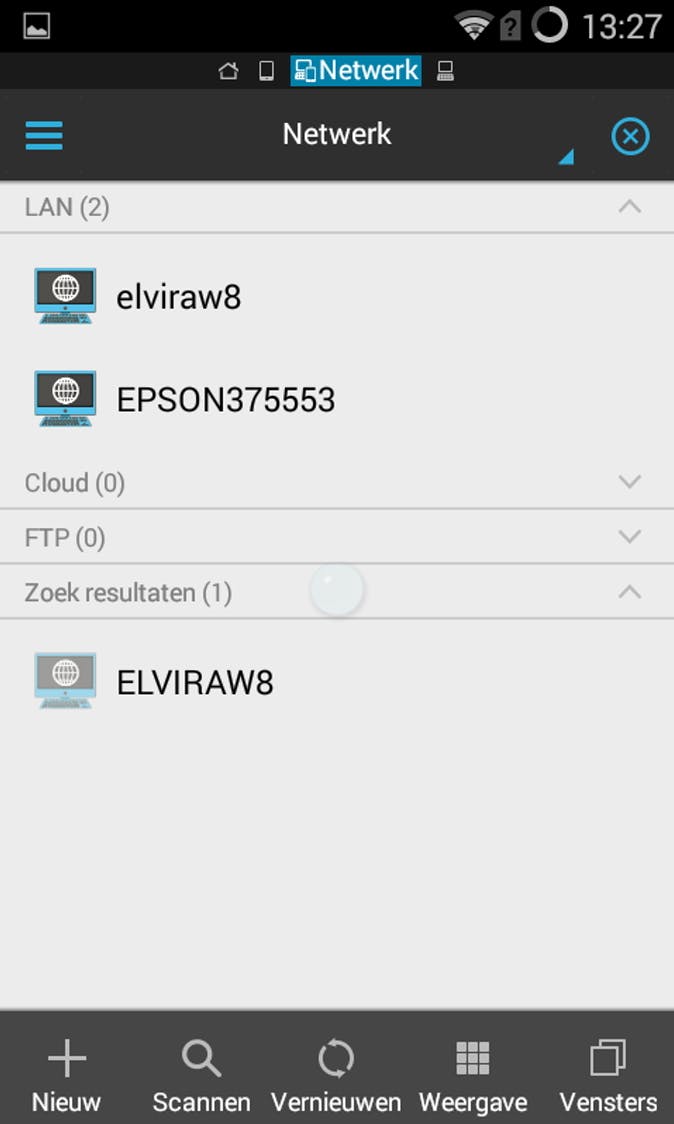 Verbinding maken kan ook via tabblad Lokaties door via het plusteken handmatig een netwerkapparaat in te voeren. In ES File Explorer tik je linksboven op de drie liggende streepjes. Kies Netwerk in het gelijknamige onderdeel. Tik op Scannen om het netwerk af te zoeken of gebruik het plusteken om handmatig een opslagapparaat in te voeren.