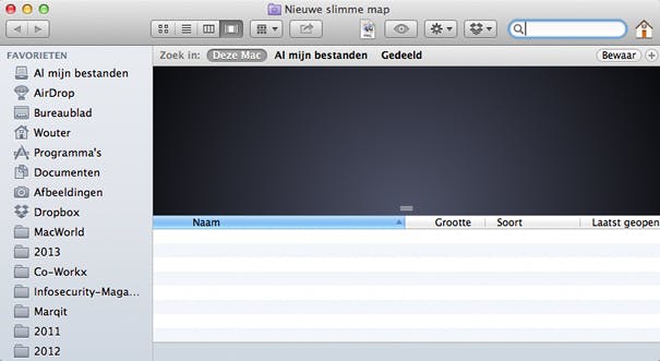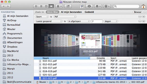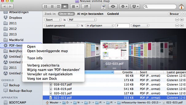 De slimme map is op vergelijkbare wijze te beheren als een normale map op je Mac. Zo kan je de map niet alleen bereiken via de navigatiekolom, maar ook door naar de locatie te gaan waar je de slimme map hebt opgeslagen. Wil je de naam van de map wijzigen? Klik dan simpelweg op de map om een nieuwe naam in te kunnen voeren. Je kunt de slimme map verwijderen door deze naar de prullenbak te slepen. Wil je de map uit de navigatiekolom verwijderen? Open dan het context-menu door met de Control-toets ingedrukt op de slimme map te klikken en kies de optie Verwijder uit navigatiekolom. Via het context-menu is het ook mogelijk de slimme map toe te voegen aan je dock.