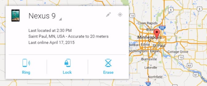 Je kunt Android Device Manager op een aantal handige manieren van op afstand benaderen. Als je slechts één Android apparaat hebt, kun je een willekeurige webbrowser gebruiken om naar de Android Device Manager-pagina te gaan en op je account in te loggen. Van daaruit kun je een plattegrond te zien krijgen met de locatie van je telefoon. Bovendien kun je commando's geven om het apparaat te ontgrendelen of volledig te wissen.