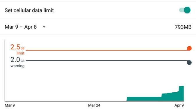 Standaard krijg je simpelweg een waarschuwing wanneer je je datalimiet bereikt hebt. Maar tegen de tijd dat je die waarschuwing ontvangt, is het vaak al te laat om je gedrag aan te passen en extra kosten of automatische afkapping te voorkomen. Het is dan ook beter om de waarschuwing te laten versturen wanneer je een paar honderd megabytes onder je limiet zit en vervolgens met het selectievakje boven de grafiek een datalimiet in te stellen. Met de rode lijn in de grafiek kun je een punt kiezen waarop je mobiele data wordt uitgeschakeld.