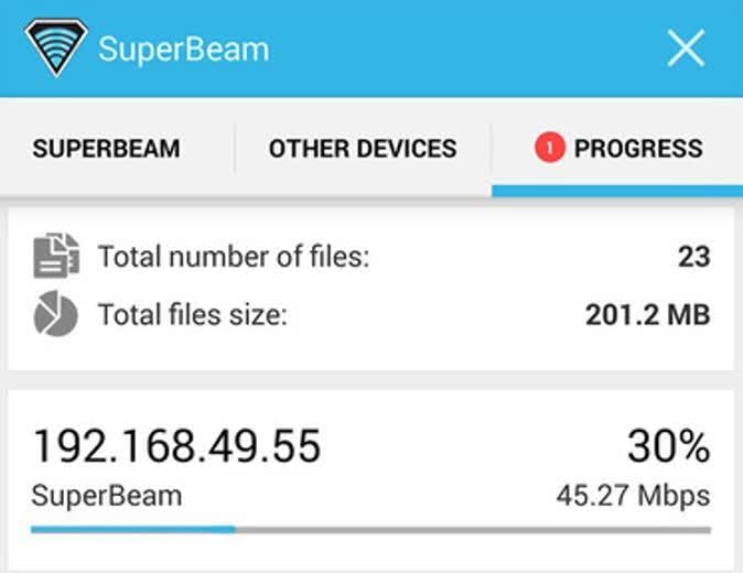 De SuperBeam app maakt supersnelle bestandsoverdrachten tussen apparaten mogelijk - zelfs 45 Mbps. De wonderen van wifi!