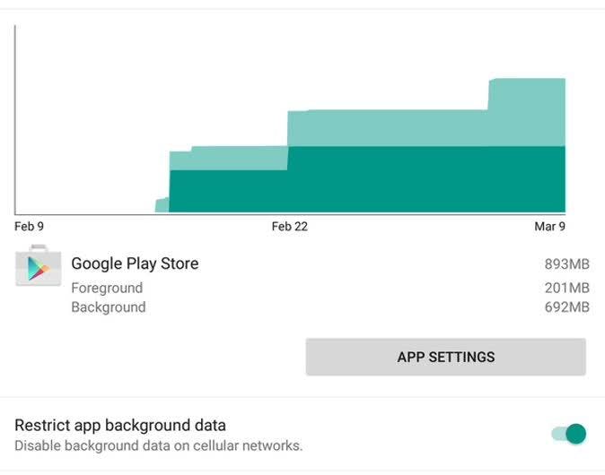 Onder de hierboven genoemde grafiek met het algemene dataverbruik staat een lijst met al je apps, gerangschikt op de hoeveelheid data die ze verbruikt hebben, beginnend bij de meest gulzige apps. Als je op een app drukt kun je details zien over de verhouding tussen voor- en achtergronddata. Als je ziet dat een bepaalde app veel bytes op de achtergrond gebruikt, kun je omlaag scrollen om de optie voor het beperken van achtergronddata in te schakelen. Let op: deze optie is alleen beschikbaar op apparaten die aansluiten op een mobiel data-abonnement.