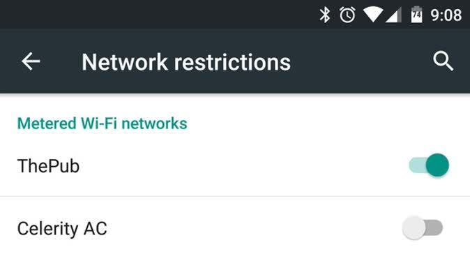 In het Data Usage-menu kun Network restrictions selecteren. Het scherm dat verschijnt geeft een lijst weer met alle wifi netwerken die met je account data gesynchroniseerd zijn. Zet de schakelaar om naast de netwerken die hotspots zijn en je apparaat zal geen misbruik van de data maken. Deze functie haakt goed in op de bovengenoemde achtergronddata beperking.