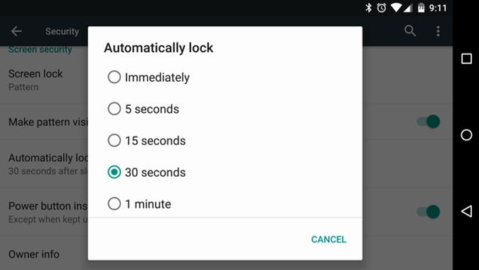In het Security menu van de meeste apparaten (Samsung heeft ook dit in het My Device-menu verstopt) staat een optie met de naam Automatically Lock. Dit item staat er alleen als je een vorm van schermbeveiliging hebt ingeschakeld. Hier kun je kiezen hoe lang je apparaat ontgrendeld blijft nadat het scherm uitgeschakeld is - op sommige telefoons gaat dit van onmiddellijk tot 30 minuten. Je kunt dan vaak ook nog gewoon de aan-/uitknop gebruiken om je apparaat meteen te vergrendelen, mocht je dat willen - dit kan door een selectievakje onder de time-out-optie aan te vinken (maar dit kan niet op alle telefoons).