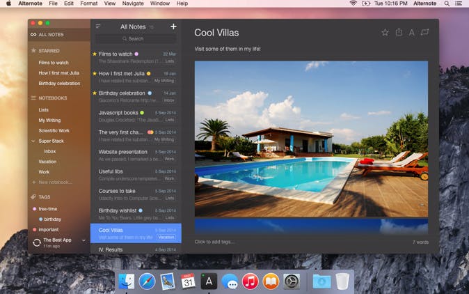 De enige app voor Evernote die je ooit nog nodig hebt. Als je de officiële app van Evernote voor je Mac niets vindt, biedt Alternote wellicht een uitkomst. De user interface is minimalistisch en goed ontworpen, wat het een hele makkelijke app maakt voor het maken van notities, verzamelen van informatie, en het opschrijven van ideeën of herinneringen. Voor gebruikers van Evernote is Alternote een absolute aanrader!