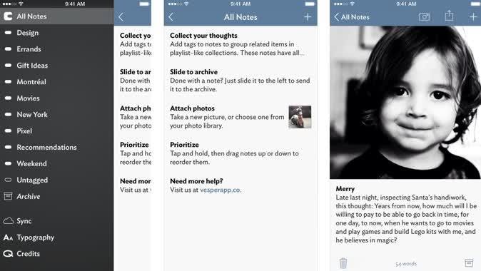 Notitie-app Vesper wil ervoor zorgen dat je heel eenvoudig je gedachten kunt bewaren en ordenen. Je kunt notities taggen waarna je deze later eenvoudig terug kunt vinden als je zoekt naar een specifieke tag of woord. Met een gratis Vesper account zijn je gedachtes altijd beschikbaar op al je apparaten.