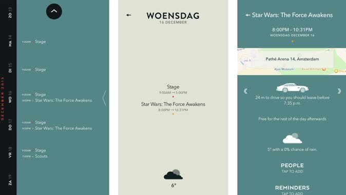 De nieuwe agenda-app van Moleskine is net zo mooi als de fysieke notitie-boekjes. Timepage is prachtig ontworpen en erg simpel te gebruiken. De app maakt van al je afspraken een lijst (er is geen maandoverzicht) en voegt onder andere weerberichten toe. Ook kun je - mocht dat weer eens legal zijn - direct vanuit de app een taxi van Uber bestellen.
