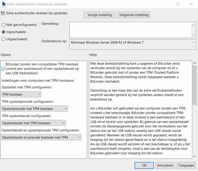 Kies voor Extra authenticatie vereisen bij opstarten door er op te dubbelklikken, selecteer Ingeschakeld en zorg dat de optie BitLocker zonder een compatibele TPM toestaan is aangevinkt. Klik op OK om de wijzigingen toe te passen en start de BitLocker-wizard opnieuw. Volg de stappen, in ons geval hoefden we enkel op Volgende te klikken en daarna even opnieuw op te starten. De wizard wordt daarna hervat, waarbij je kunt kiezen voor de versleuteling, namelijk door middel van een usb-stick of een wachtwoord. Als je voor een usb-stick kiest, moet je deze invoeren bij het opstarten van Windows om door te gaan.