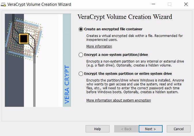 Tip 06 Kies voor de optie Create an encrypted file container om een versleutelde, virtuele partitie aan te maken.