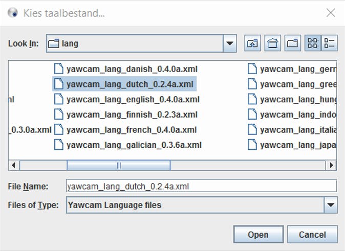 Je downloadt Yawcam hier. Klik op yawcam_install.exe en voer het gedownloade bestand uit. Klik op Ja om door te gaan, ga akkoord met de licentie en kies een aantal keer voor Next / Install en klik achteraf op Finish. Yawcam opent zich nu. Als je Yawcam in het Nederlands wilt, kies je voor Settings / Edit Settings en dan klik je links op Language en Change. Kies voor yawcam_lang_dutch_0.x.x.xml en klik op Open en OK.