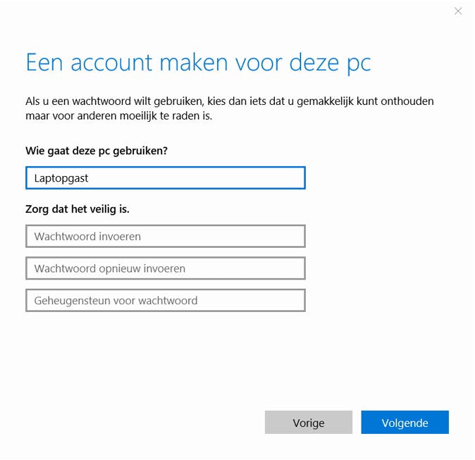 Om te zorgen dat Prey en Yawcam zijn werk kunnen doen, is het wel vereist dat de laptop verbonden is met internet. De kans is klein dat dat gebeurt als de dief zich niet kan aanmelden. Deze gaat 'm dan natuurlijk opnieuw installeren. Daarom kan het handig zijn een extra gebruiker aan te maken. Op die manier heb jij tijd om je laptop en de dief op te sporen met Yawcam en Prey. Je maakt een extra gebruikersaccount in Windows 10 aan door naar de app Instellingen te gaan en te kiezen voor Accounts. Klik op Familie en andere gebruikers / Iemand anders aan deze pc toevoegen. Ga daarna naar Ik beschik niet over de aanmeldgegevens van deze persoon en kies voor Gebruiker zonder Microsoft-account toevoegen. Vul nu een gebruikersnaam in, bijvoorbeeld Laptopgast, laat het wachtwoord leeg en klik op Volgende om de gebruiker toe te voegen.