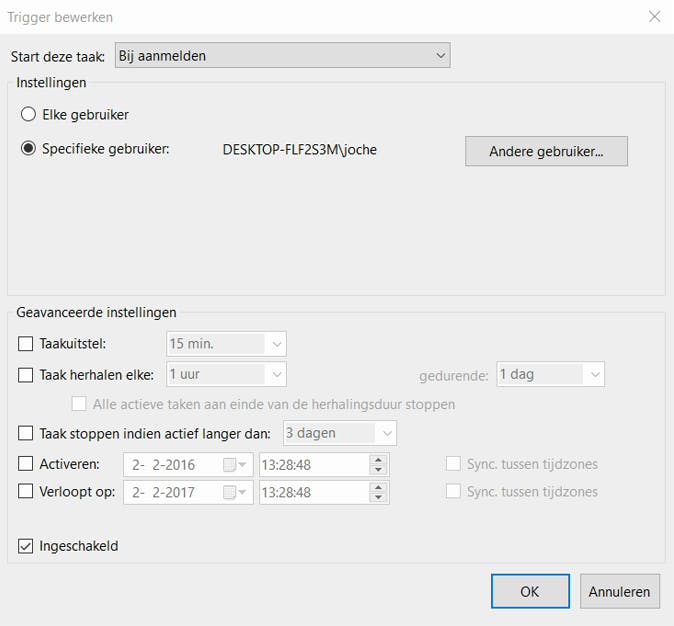 Om te voorkomen dat Yawcam actief is als jij je inlogt, ga je naar de Taakplanner door ernaar te zoeken in het startmenu. Klik links op Task Scheduler-bibliotheek en kies rechts voor Nieuwe taak. Geef de taak een naam en ga naar het tabblad Triggers. Klik op Nieuw en kies uit de lijst bij Start deze taak voor de optie Bij aanmelden. Selecteer Specifieke gebruiker en klik op OK. Ga naar Acties en klik op Nieuw. Klik op Bladeren en blader naar C:\Program Files (x86)\Yawcam en kies voor Yawcam-NTservice-STOP.bat. Klik op Openen / OK. Ga naar het tabblad Condities en haal de twee vinkjes weg bij Energie. Klik op OK om de taak op te slaan.