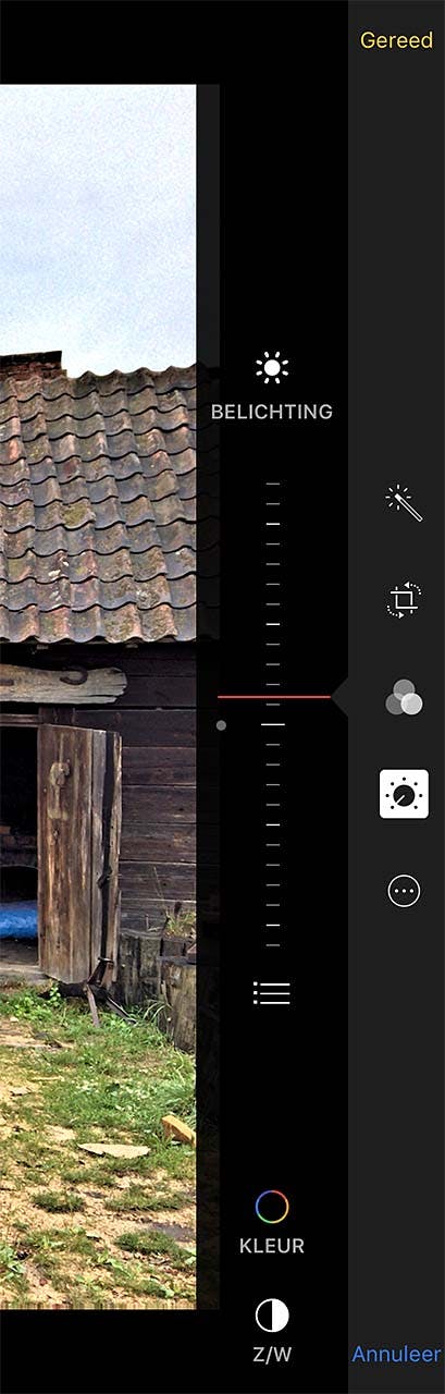 De 'truc' is eveneens beschikbaar voor de knop KLEUR. Ook hier vind je weer een knopje met drie keer een .- onder elkaar. Tik erop en je ziet afzonderlijke opties voor Verzadiging, Contrast en Kleurzweem verschijnen. Klik wederom op Sluit als je klaar bent met het aanpassen van kleuren. En als je helemaal klaar bent met bewerken, dan is er de knop Gereed rechtsboven in beeld. Daarmee wordt de foto inclusief (ook in de toekomst herstelbare) wijzingen op de Filmrol bewaard.