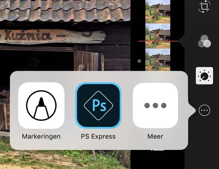 Mocht je al doende tijdens het fotobewerken in de app Foto's tot de ontdekking komen dat een bepaalde functie die je nodig hebt ontbreekt, dan is er geen man overboord. Tik op de knop bestaande uit een cirkeltje met daarin drie puntjes. Je ziet nu een ballon met daarin in ieder geval de standaardoptie Markeringen. En als het goed is ook een of meer op je i-apparaat geïnstalleerde fotobewerkingsapps. Niet? Dan moet je ofwel een dergelijke app installeren, of even op de knop Meer tikken. Je kunt nu fotobewerkingsapps die op je apparaat zijn geïnstalleerd aanzetten. Zet er niet te veel tegelijk aan, want dan wordt het straks in de ballon erg onoverzichtelijk. In ons voorbeeld zien we de app PS Express. Door hier op te tikken, opent deze app met de deels in Foto's al bewerkte foto geopend. Doe je ding in de fotobewerker en klik op Gereed als je klaar bent. De foto wordt nu - inclusief bewerkingen - weer terug overgeheveld naar Foto's. Ideaal, want zo hoef je nooit bang te zijn om tijdens het bewerken in Foto's door een ontbrekende functie in een andere app helemaal opnieuw te hoeven beginnen!
