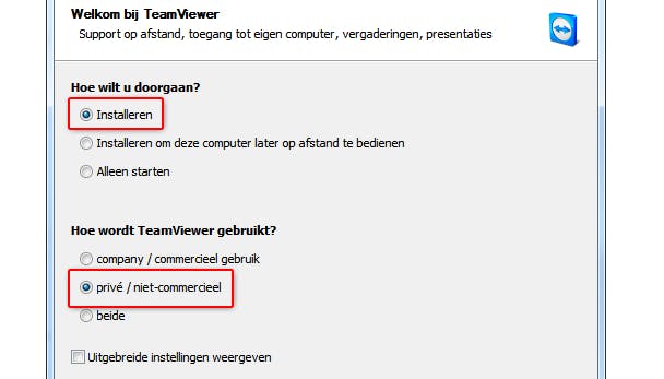 Kies de juiste opties tijdens de installatie van TeamViewer.