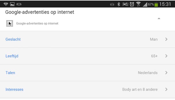Om bij je advertentiepagina te komen, open je Instellingen op je tablet of smartphone. Kijk onder Accounts en klik op Google. Helemaal onderaan staat nu Advertenties, klik hierop en je komt op je persoonlijke advertentiepagina die door Google in elkaar is gezet op basis van je surfverkeer op het web.