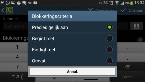 Als je met een stalker te maken hebt, of simpelweg niet door dat ene nummer gebeld wilt worden, dan kun je die blokkeren bij Nieuw. Dit kan ook als je niet het hele nummer weet. Bij Blokkeringscriteria kun je je bepalen wat de criteria zijn om een nummer te blokkeren. Deze kan Precies gelijk aan het telefoonnummer zijn dat je opgeeft, maar als je enkel de begin- of eindcijfers weet kun je ervoor kiezen om Begint met of Eindigt met aan te vinken. Mocht je enkel een nummercombinatie van een paar getallen weten, dan kies je voor de optie Omvat. Alle nummers die deze combinatie omvatten, worden geblokkeerd.