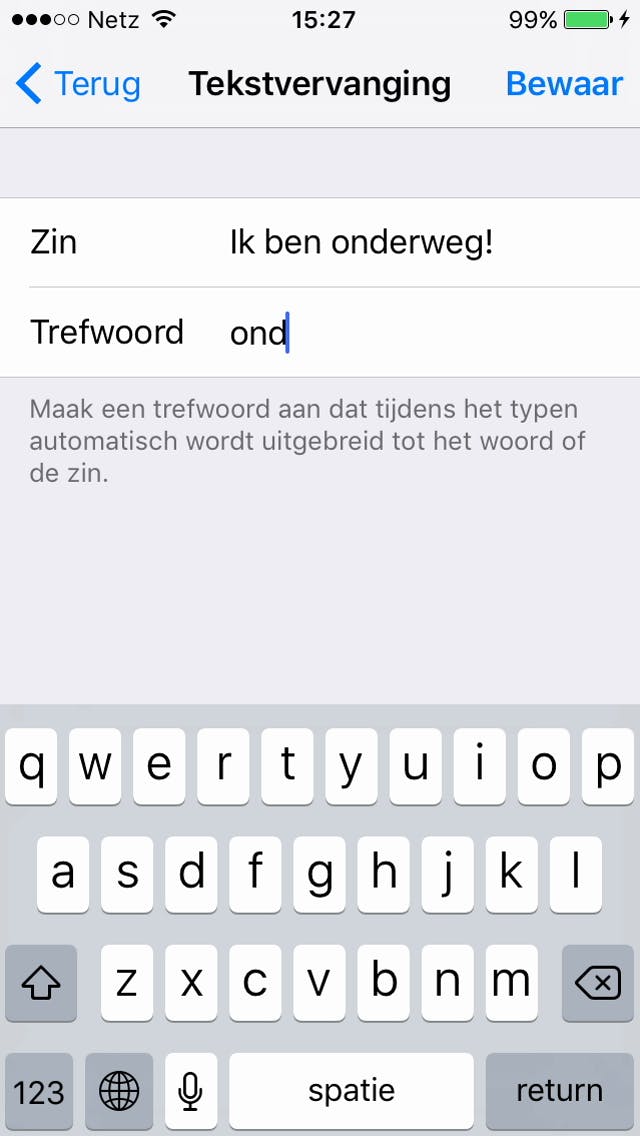 Bij Instellingen / Algemeen / Toetsenborden ga je naar Tekstvervanging en tik je op het plusje rechtsboven. Achter Zin geef je de volledige zin aan, achter Trefwoord een afkorting van drie à vier letters. Sluit af door op Bewaar te tikken.