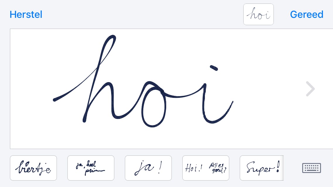 Wil je je geschreven tekst invoegen, tik dan op Gereed. Je wist je kladblok door op Herstel te tikken. Zodra je op Gereed hebt getikt, verschijnt de tekst als plaatje in je chat en kun je het versturen door op de blauwe pijl te drukken.