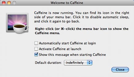 Caffeine biedt hier een oplossing voor. Het programma nestelt zich in de menubalk en schakelt energiebesparende opties aan of juist uit. Desgewenst kan het programma direct tijdens het inloggen starten. Een klik op het icoon volstaat voor het in- of uitschakelen. Aardig is ook de mogelijkheid dat u - door met rechts op het icoon te klikken - de energiebesparende maatregelen tijdelijk uit kunt schakelen. Dit kan bijvoorbeeld handig zijn bij een presentatie. U kunt de energiebesparende stand daarbij automatisch weer in laten gaan, zodat de onbeheerde computer niet in stand-by gaat of het scherm dimt.