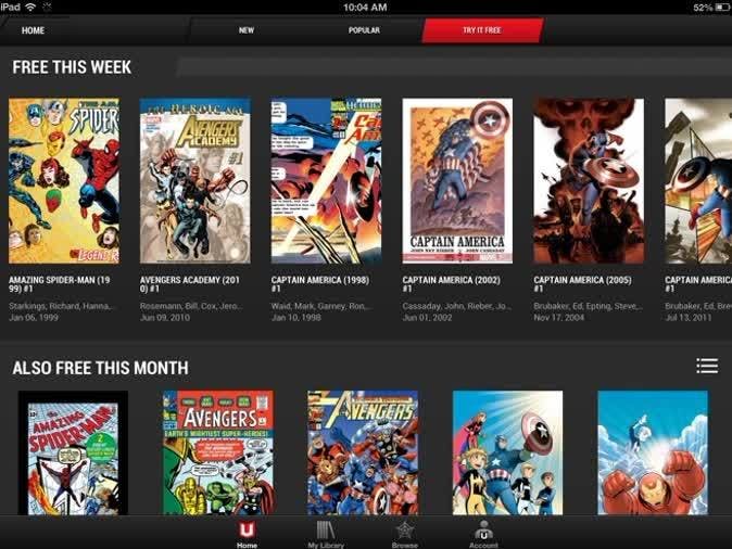 Marvel is van de grote uitgeverijen op het gebied van comics wel een beetje de voorloper. Al jaren zijn ze bezig met het aanbieden van comics, wat met de lancering van hun spotify-achtige Marvel-app een enorme boost heeft gekregen. Je betaalt een vast bedrag per maand, waar je het volledige aanbod voor kunt kopen. Hier heb je pas echt een enorm aanbod. Tienduizenden comics zijn door Marvel ingescand, en worden ook nog steeds gescand, waardoor je niet alleen maar nieuwe comics kunt lezen maar ook klassieke verhalen. De app is erg overzichtelijk, en vol met handige features. Zo kun je snel de strips van een bepaalde held op een rijtje krijgen, een bepaalde klassieke verhaallijn lezen of bekijken wat voor nieuwe strips er online staan. Let wel dat de nieuwste comics die hier opstaan zes maanden oud zijn, om de losse verkoop van digitale strips en gedrukte exemplaren niet teveel in de weg te lopen.
