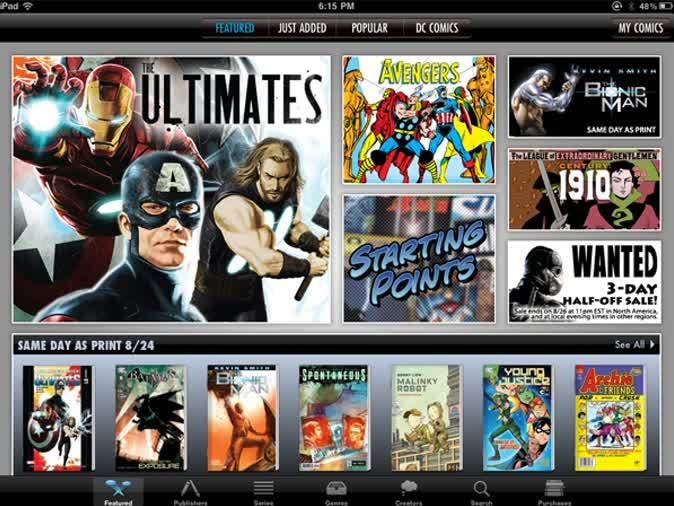Deze app was eigenlijk de eerste grote comics app, en hij wordt nog steeds een beetje gezien als de iTunes op comics gebied. Hier staat een enorm aanbod aan Amerikaanse comics op je te wachten. Er is eigenlijk geen uitgeverij te noemen die hier zijn comics niet aanbiedt. DC. Marvel, Dark Horse, Image, Boom, Valiant en meer zorgen er hier voor dat hun nieuwste comics op dezelfde dag te koop zijn als ze in de winkel liggen. Helaas ook voor dezelfde prijs. Zo betaal je voor een nieuwe comic al gauw 3 of 4 euro, wat een behoorlijk bedrag is voor een digitaal bestand van welbeschouwd 22 pagina's en een cover. Comixology heeft dan weer wel een groot aantal uitverkoopmomenten, waar je dan bijvoorbeeld in een keer een hele serie, of een bepaalde verhaallijn mee kunt kopen.