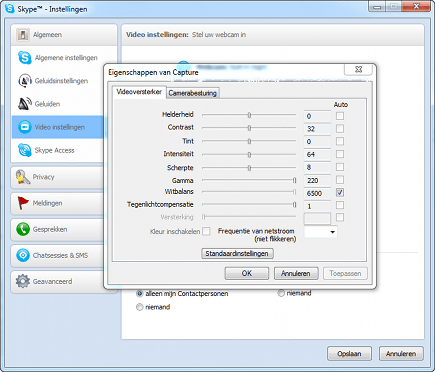 Een van de grote voordelen van Skype boven de reguliere telefoon is dat u tijdens het bellen gebruik kunt maken van video. Dit kan alleen als u van Skype naar Skype belt. Uiteraard dient u hiervoor wel te beschikken over een webcam, welke u vervolgens binnen Skype configureert. Op de pc doet u dit door te klikken op Extra / Instellingen en vervolgens op Video-instellingen. Voor de video-instellingen van Skype binnen OS X klikt u op Skype in het menu linksboven, en vervolgens op Voorkeuren / Video. Als het goed is krijgt u direct live-beeld van uw webcam te zien. Blijft het zwart of krijgt u een foutmelding, controleer dan of u niet nog een andere applicatie open hebt staan die gebruikmaakt van de webcam, deze kan namelijk maar één applicatie tegelijk aan. Via de opties onder het beeld kunt u aangeven van wie u automatisch video wilt ontvangen (iedereen, alleen uw contactpersonen of niemand) en aan wie u wilt laten weten dat u kunt videobellen (uw contactpersonen of niemand). Via de knop Webcam instellingen kunt u specifieke instellingen aanpassen zoals de helderheid, het contrast, enzovoort.